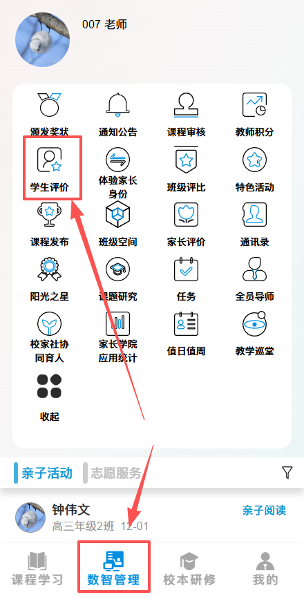 登录校本研修公众号“我是教师”,找到“数智管理”栏目,进入“学生评价”模块