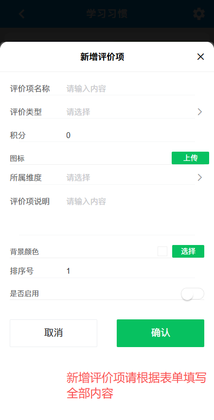 进入评价项列表,右上角可新增新的评价项,根据表单填写对应的内容即可生成