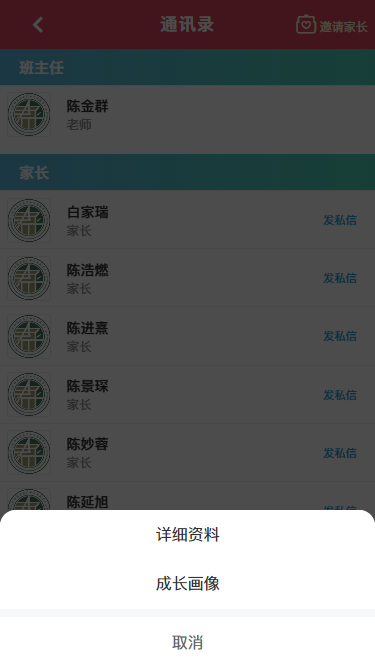 2、进入列表后找到需要增加家长账号的学生,点击头像姓名处,选择详细信息进入详情页面