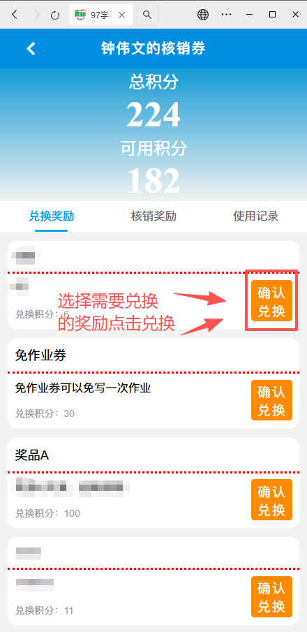 点击进入后选择兑换的学生